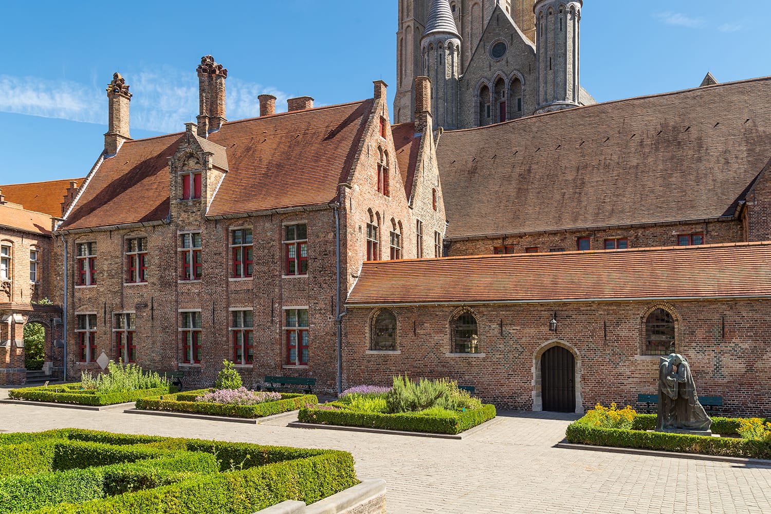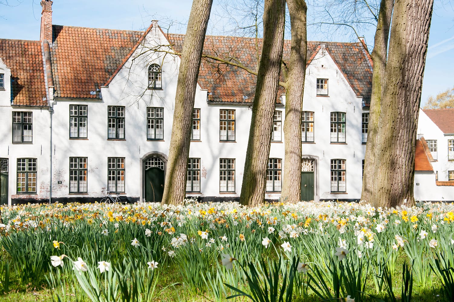 市の中心部からさらに離れて、次の目的地は、ブルージュ ベヒンホフの美しい白い家々です。このベギン会修道院は、修道生活を送ることを選択した解放された信徒女性のためのコミュニティであり、その歴史は 1245 年にまで遡り、市内の他のどこにも見られません。木々が生い茂る小さな公園を中心に、伝統的な白い家々が立ち並び、現在は聖ベネディクト会の修道女たちが住んでいます。水仙などの花々が咲き誇り、色彩豊かな海を生み出す春は必見です。