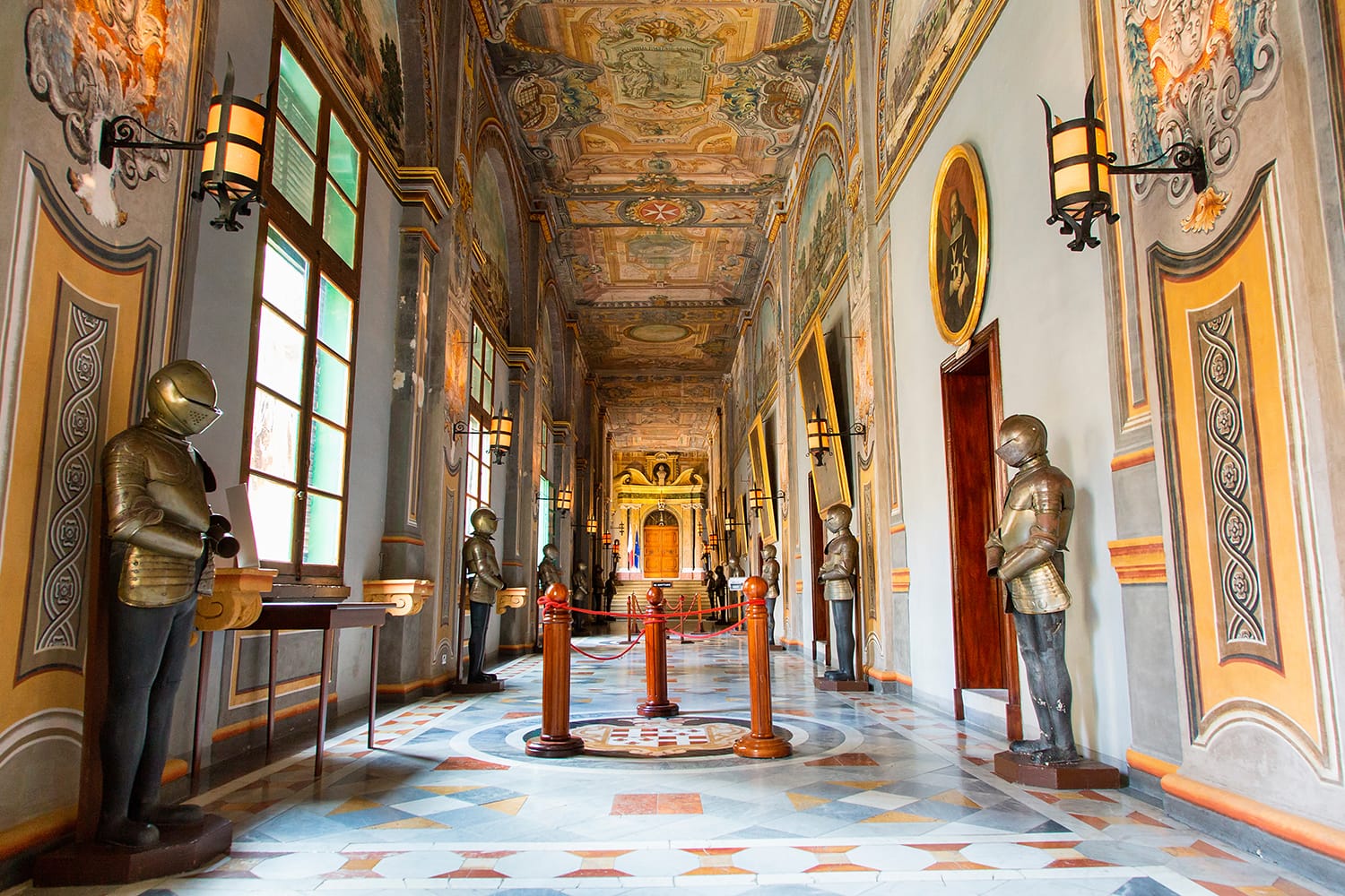 州の部屋を見学すると、宮殿の平和な中庭と壮大な部屋のいくつかが、何世紀にもわたってさかのぼるタペストリーを備えています。宮殿の武器庫に関しては、展示されている武器と鎧だけでなく、かつての玉座の部屋と美しいフレスコ画を特徴とする大使のホールも持っています。