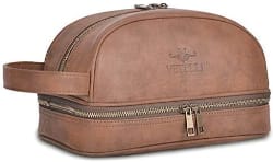 この美しい革製のトイレタリーバッグは、間違いなくバスアメニティを入れるのに最適なトラベルバッグの 1 つです。 Vetelli Leather Dopp Kit は高級感を念頭に置いてデザインされており、外側は高級 PU レザー、内側はナイロン、内側の底は耐水性です。内部には 2 つの独立したジッパー収納コンパートメント、2 つの内部ジッパー ポケット、2 つのメッシュ ポケットが含まれています。このバッグには、ローションやシャンプーなどを入れるための 2 オンスのトラベルボトル 2 本も付属しています。 12 インチ x 6 インチ x 4 インチの Vetelli Leather Dopp キットは、スタイリッシュに見えながらバスアメニティを保護するクラシックなキットです。
