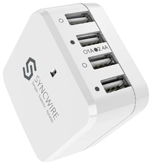 Syncwire USB ウォール チャージャーは、4 つの USB ポートを備えた軽量、コンパクト、ポータブル アダプターです。折りたたみ式の米国用プラグに加え、EU および英国用の交換可能なプラグも備えています。この充電器は、接続されているデバイスの種類を検出し、デバイスをより速く充電できるように最適な充電電流を生成します。短絡防止、温度制御、サージ保護などを含むマルチプロテクト安全システムを備えています。重量わずか 6.7 オンス、寸法 2.2 インチ x 1.6 インチ x 2.4 インチの Syncwire USB ウォールチャージャーを使用すると、携帯電話から Bluetooth スピーカーまであらゆるものを簡単に充電できます。