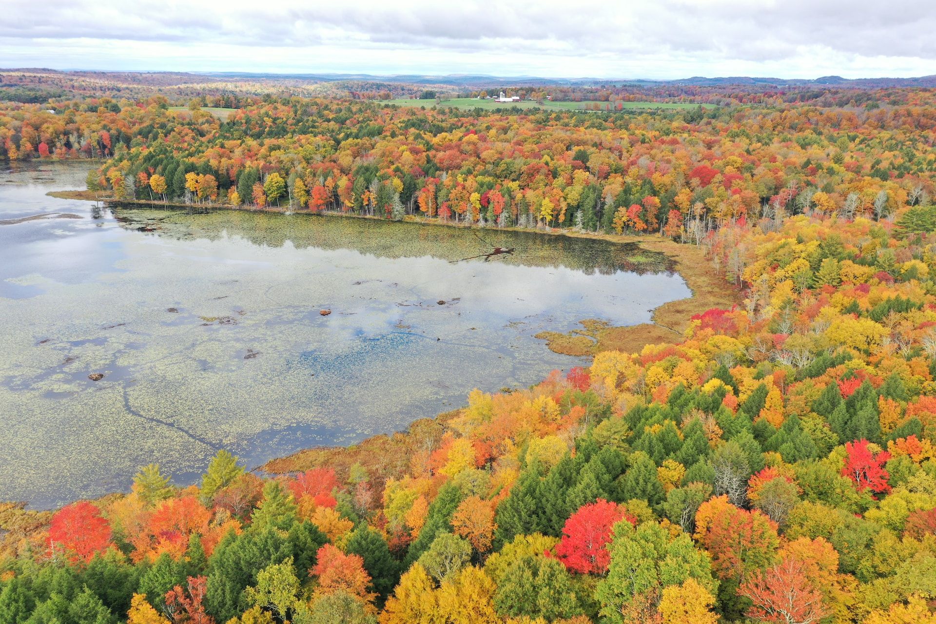 ニューヨーク州ベセルの湖の周りに鮮やかな赤、オレンジ、黄色の葉を持つ木々