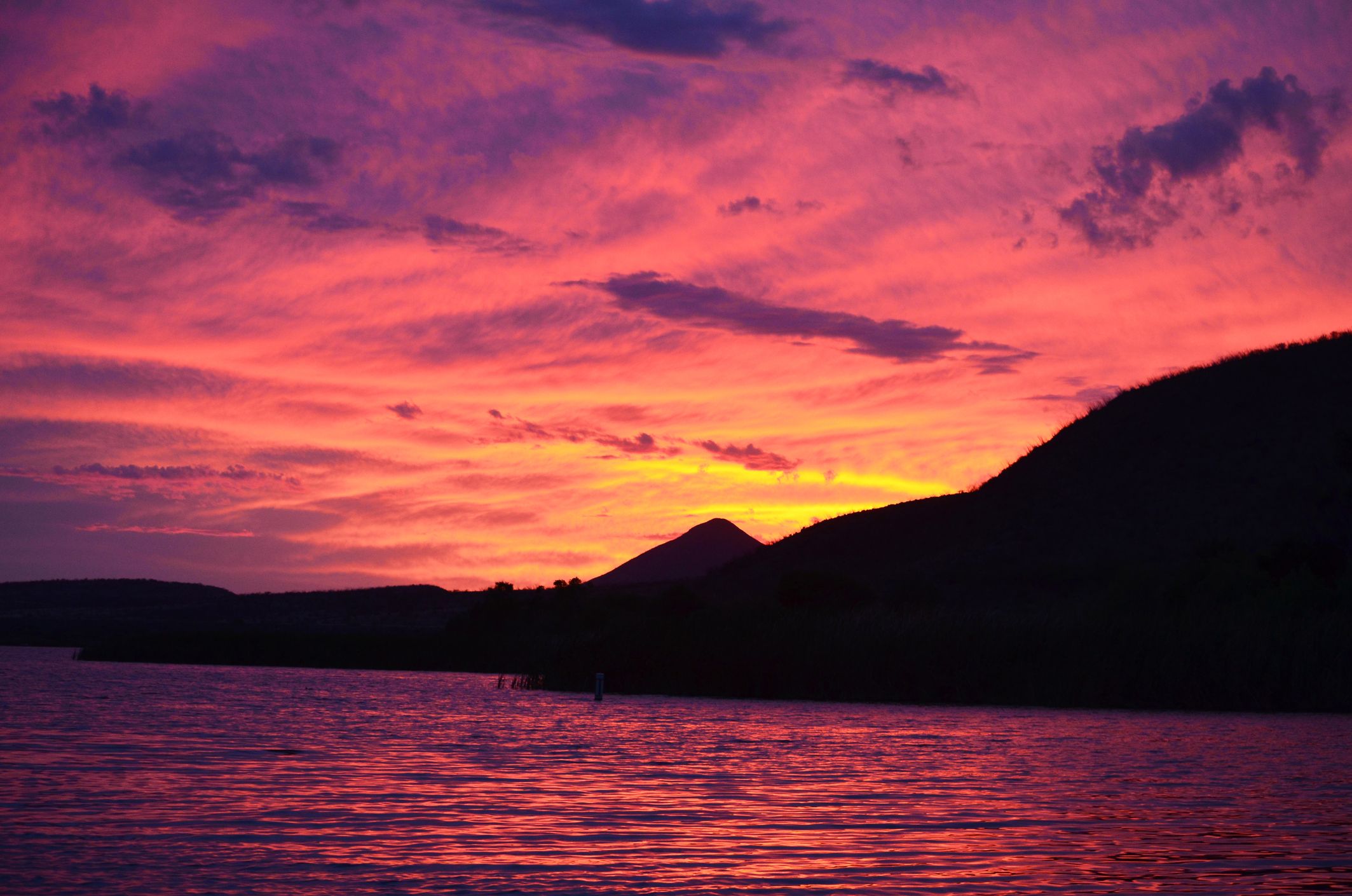 アリゾナ州ノガレスのパタゴニア湖州立公園ビーチでの美しい夕日の劇的な景色
