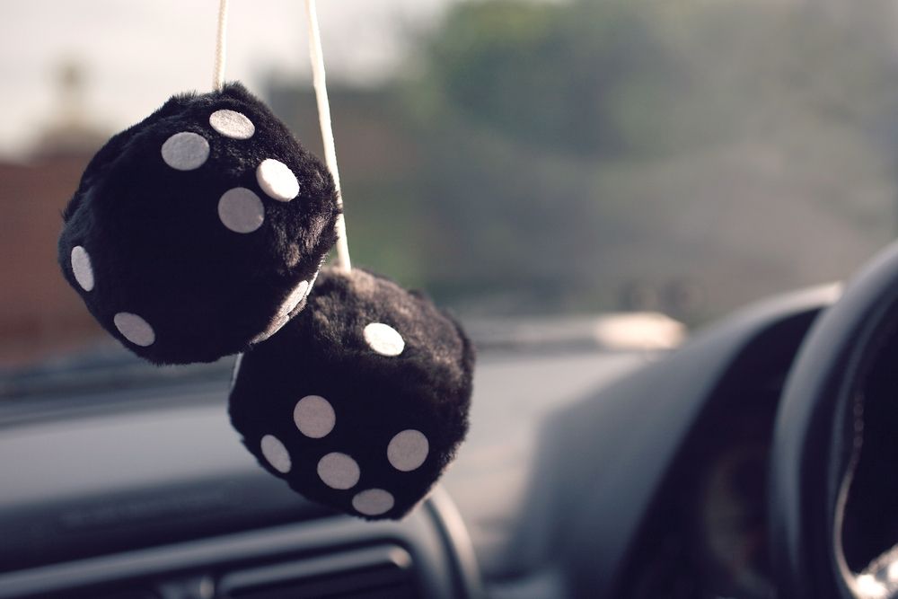 フロントガラスの前の車にぶら下がっている毛皮のようなサイコロ