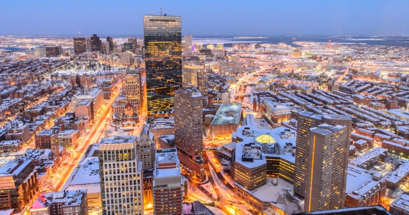 夕暮れ時の吹雪の後、プルデンシャル タワーの頂上からボストンの景色を眺める