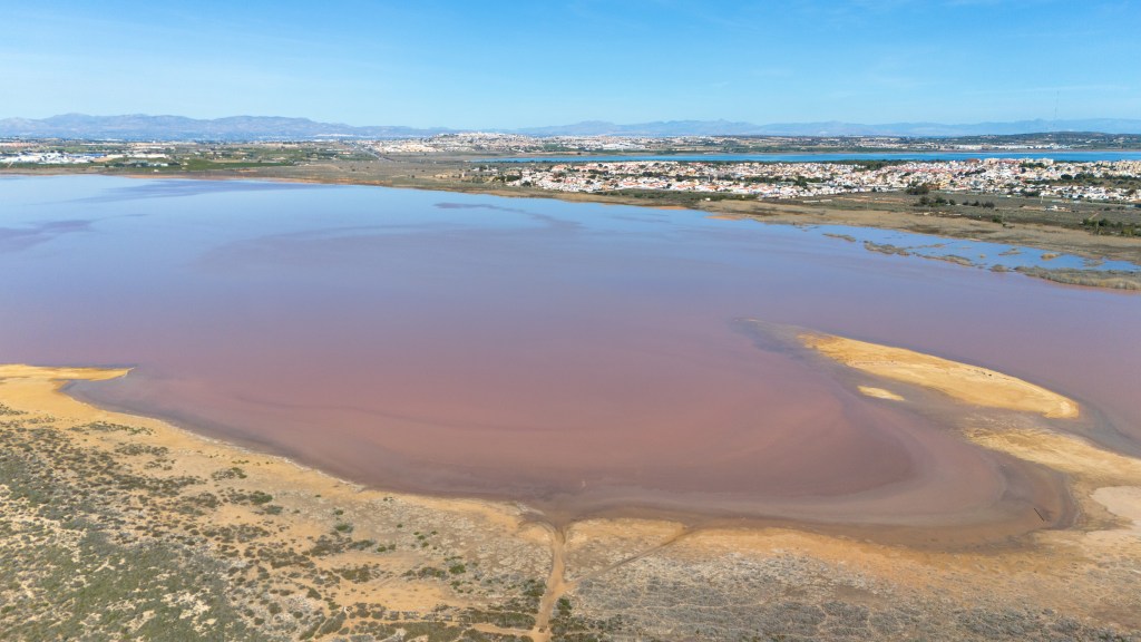 Las Salinas de Torreviejaには、ピンク色のLaguna Saladaを含む2つの異なる湖があります。多くの場合、旅行の写真でバブルガムピンクと呼ばれると、現実には、湖の色は微生物、照明、写真家に依存しています。