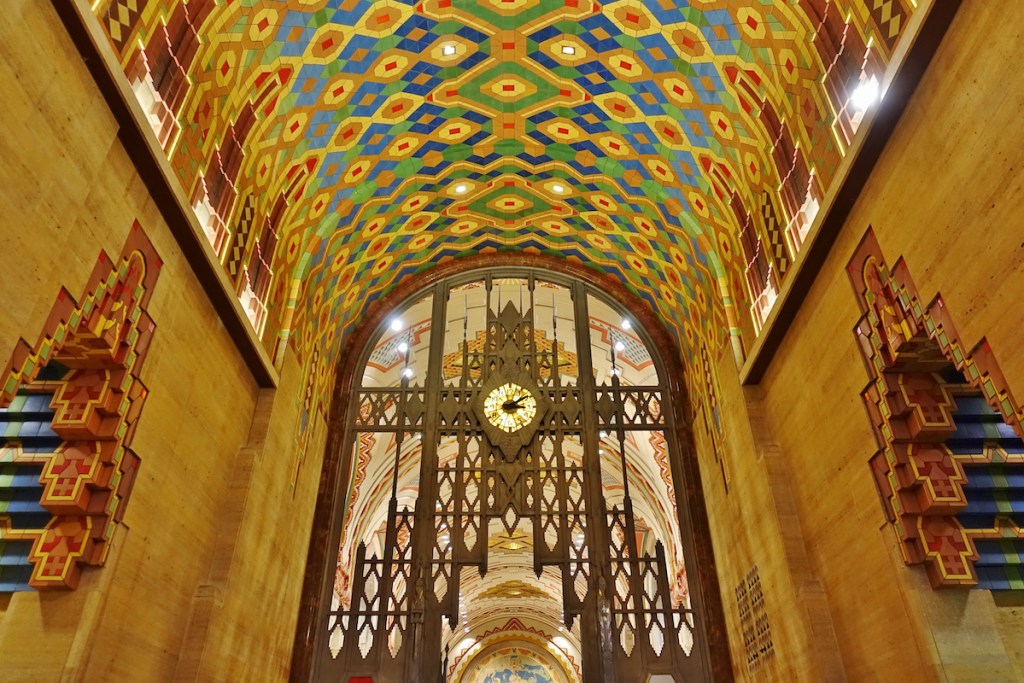 ツアーに参加することなく、この見事な建物のロビーを見ることができます。ロビーカフェでコーヒーを一杯楽しんでください。明るい金、青、レッドの美しい壁画が壁を飾ります。建物の外観は、花崗岩のベースを備えたタンジェリンレンガです。
