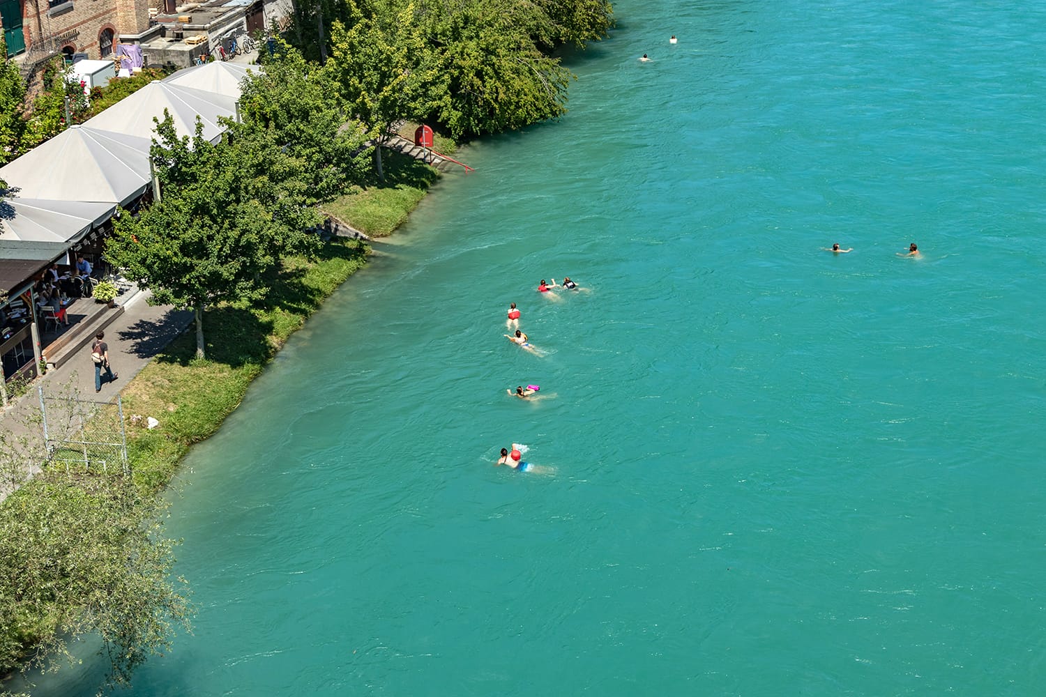 さらに上流のアイヒホルツ公園から始まり、人々が川に飛び込み、流れに乗ってベルンに戻っていく様子が見られます。毎年夏になると、泳いだり、膨らませるプールのおもちゃを持って川を下る人々の姿が見られます。川にかかる低い橋から飛び降りる人もいます。マルツィリに到着すると、彼らは車を降りてアイヒホルツまで歩いて戻り、再び出発します。川の流れの速さのため、このアクティビティは泳ぎが得意な方のみに適していることに注意してください。