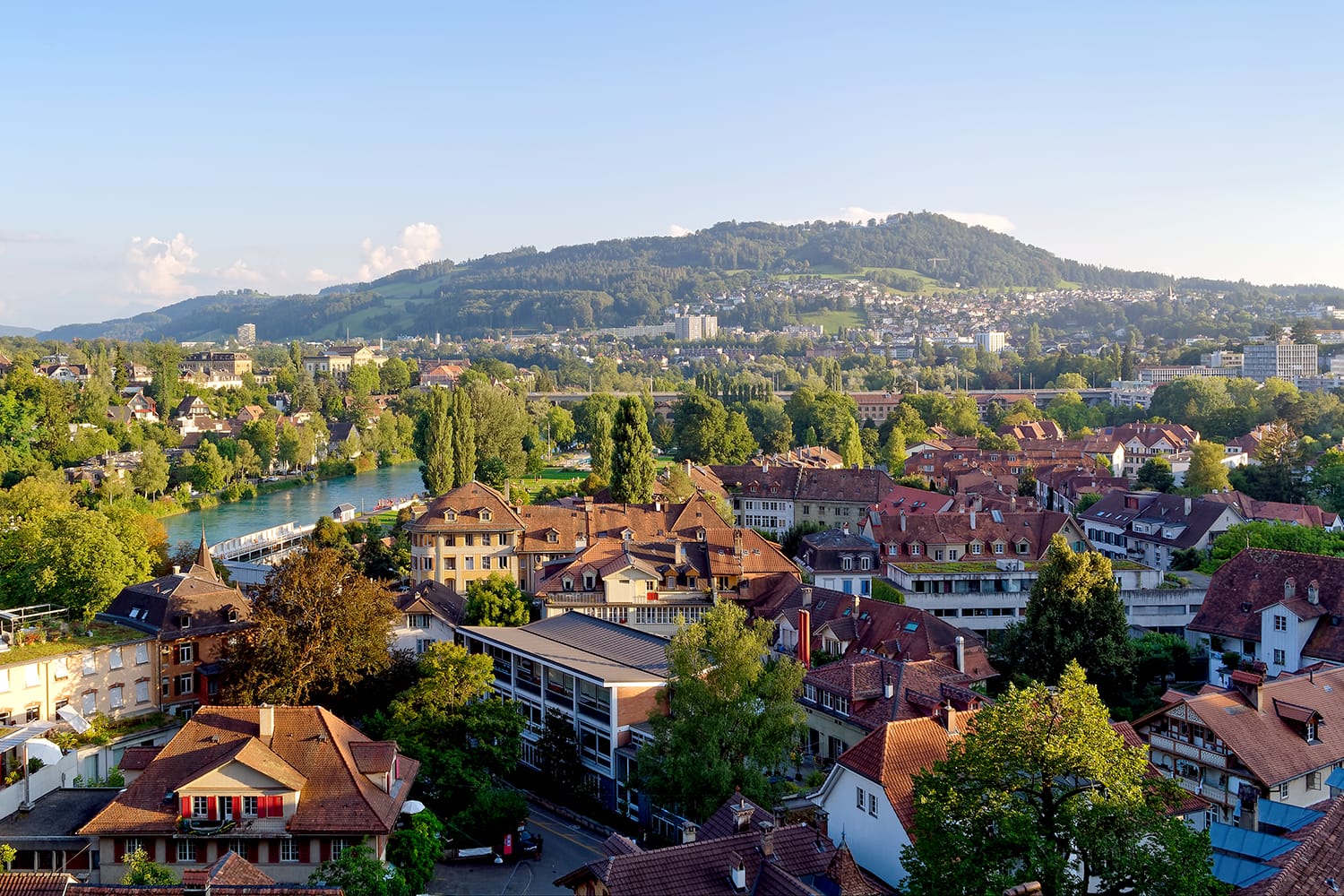 一日の終わりには、ベルンで最高のビューポイントの 1 つへ向かい、街の美しい川沿いを眺めましょう。実際、アーレ川の東岸にはいくつかの良い選択肢があり、その 1 つがローゼンガルテンです。ここはベルンで最も静かなくつろぎの場所の 1 つであるだけでなく、川を渡って歴史的中心部までの素晴らしい景色を眺めることができます。このビューポイントの唯一の問題は、ビューの一部を遮る木があることです。遮るもののない街の眺めを楽しむには、コラーヴェーク近くのグローサー ムリスタルデンに向かいましょう。そこからは、特に夕日を眺めながら滞在すると、ベルンの本当に素晴らしい景色を眺めることができます。