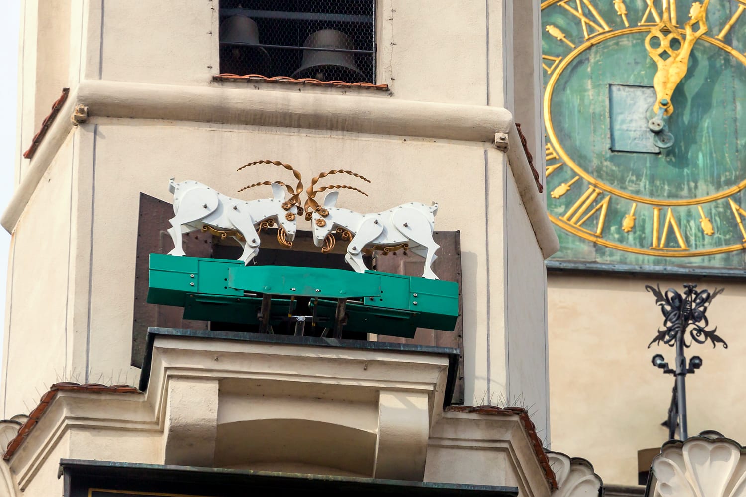 物語は、16世紀には、元の市庁舎が大規模な火災の後に燃え尽き、1550年に建物が再建されたということです。市長は、新しい建物に時計付きの壮大な塔を持つことを望んでいたので、市は市庁舎の再開を祝うために大規模なパーティーを開くことにしました。パーティーは壮大なeast宴を含めることであり、ピエトレックという名前のシェフが食事を担当しました。ピエトレックはごちそうを調理することを光栄に思っており、鹿肉の脚のメインディッシュを調理することができました。鹿肉の脚が火事で焙煎していると、ピエトレックはキッチンから休憩を取り、ホールの新しい時計を見るために外に向かいました。彼が戻ったとき、彼は鹿肉の足が焙煎棒から落ちて火の中で燃えていることを発見しました。食事と彼の評判を救うために必死で、彼は近くの畑にひっかかり、鹿肉の代わりに2人のビリーヤギを盗んで料理をしました。しかし、彼がヤギを台所に入れると、彼らは逃げて塔の階段を駆け上がりました。市場広場にいたすべてのパーティー参加者は、時計を見上げて、2人のビリーヤギが頭をノックして戦っているのを見たときにショックを受けました!党と市長は、不条理な光景で笑いながら噴火した。ヤギの戦いが夜のハイライトになったため、ピエトレックは許され、その後、市長はイベントを思い出すことができるように、2人のヤギのメカニズムを時計の下に置くことを要求しました。