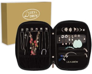 少し大きめのトラベルケースをお探しなら、この Lily & Drew 製品が最適なジュエリー トラベル オーガナイザーになるかもしれません。サイズは9.6インチ x 7インチ x 2インチで、リングバー、6つのネックレスループ、28個のイヤリング穴があります。ケースの左側のジュエリーと右側のジュエリーを分ける取り外し可能なベルベットポーチも付いています。内側にはブレスレットや時計を収納できるポケットが2つあります。エレガントなギフトボックスに入っているので、ご自身の旅行だけでなく、冒険好きなお友達への旅行ギフトとしても最適です。