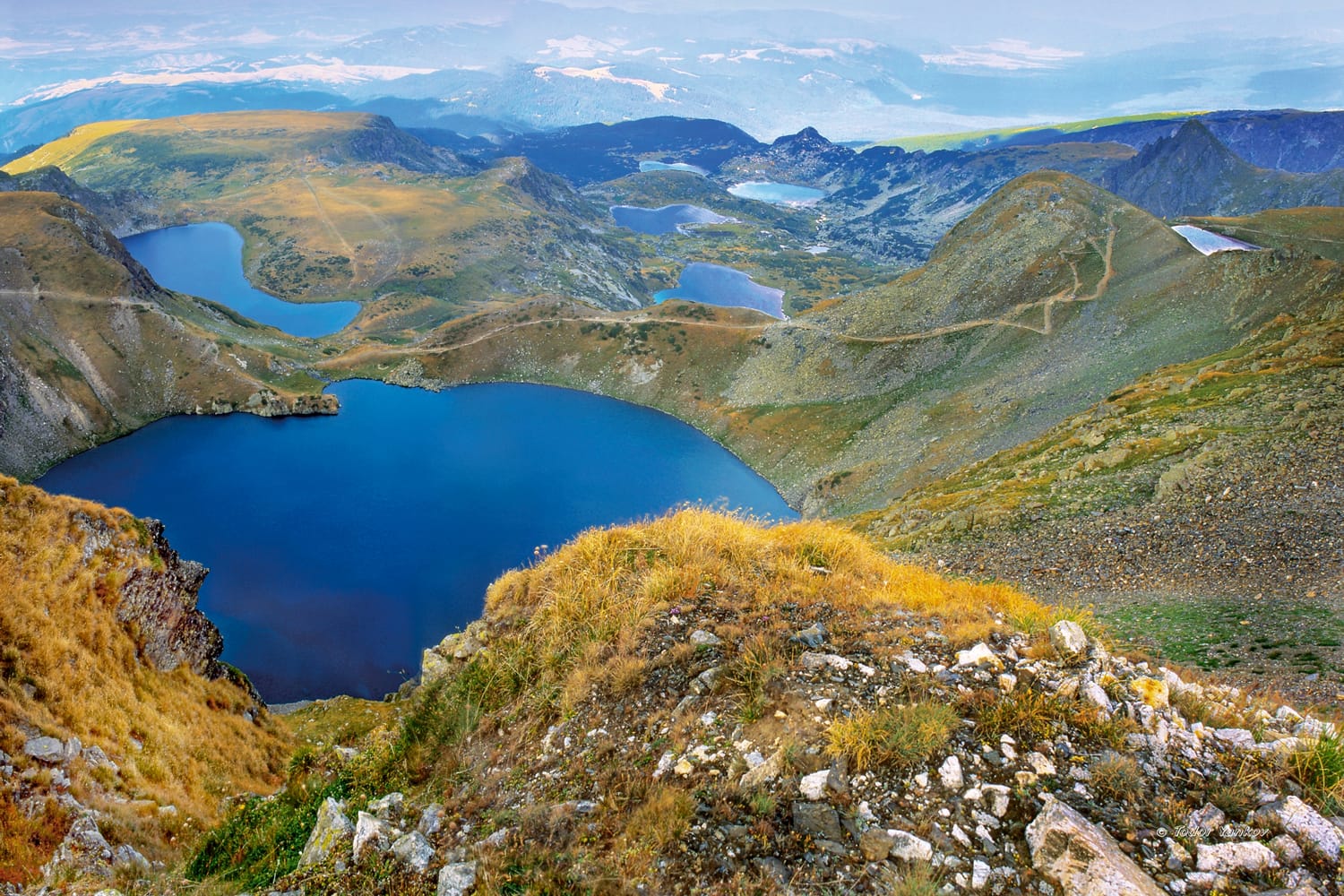 リラ山脈の北西部に位置するリラ七湖は、驚くほど美しい自然地域です。湖までハイキングすると、険しい山頂の壮大な景色が広がります。リラ七湖は氷河湖の集まりで、地元の人々は主にその形からインスピレーションを得て、「目」、「腎臓」、「涙」、「双子」、「三つ葉」、「魚の湖」、「下の湖」という名前を付けています。これらの湖は、ブルガリア最大の国立公園であるリラ国立公園内にあります。