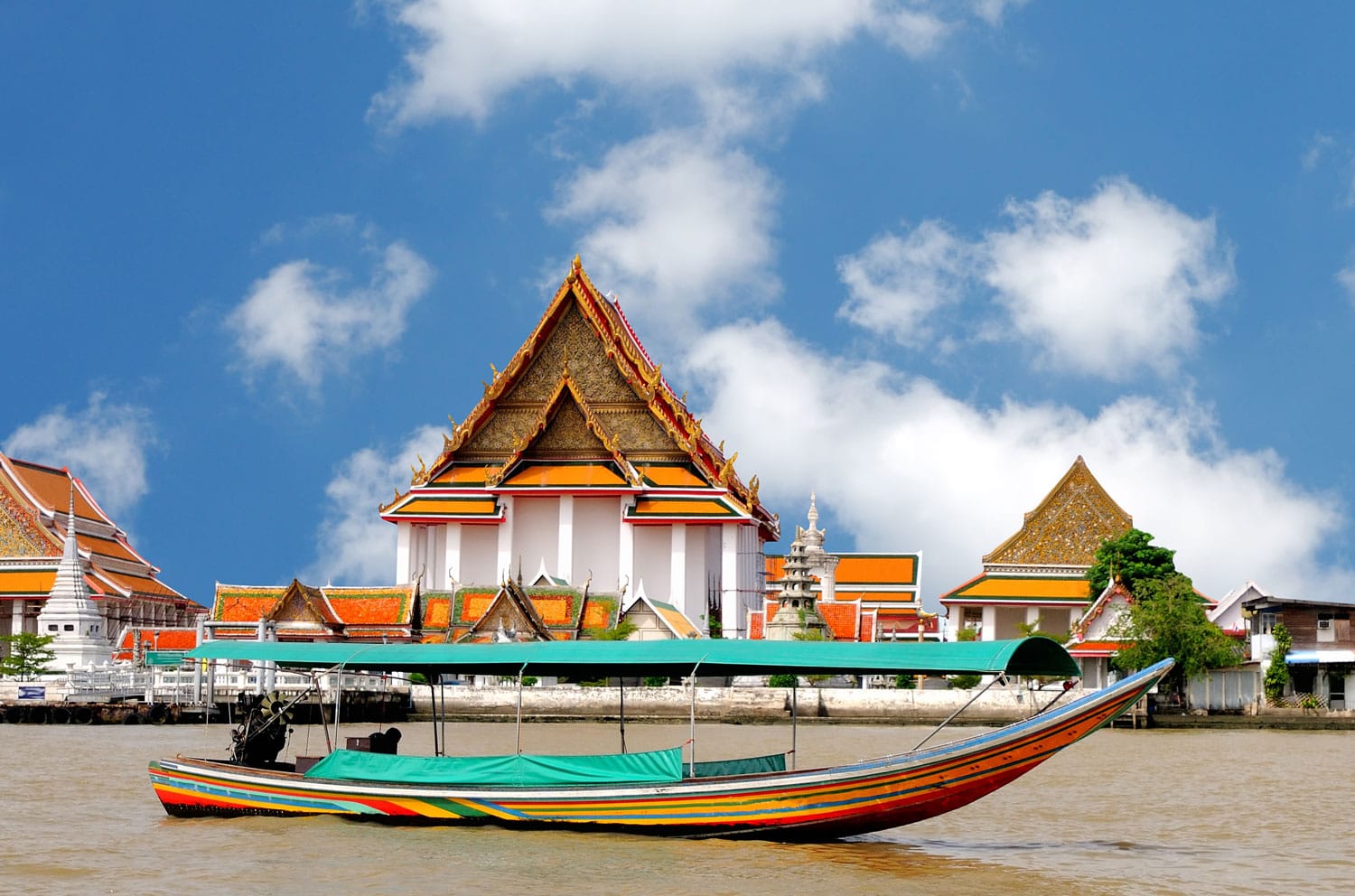 宮殿から少し歩くと、チャオプラヤー川のウォーターフロントに到着します。この大きな川はバンコクを貫き、他のランドマークとは異なり、この街を特徴付けています。川沿いに立っていても素晴らしい景色が楽しめますが、その美しさを鑑賞するには実際に水上に出なければなりません。特別なことをする必要はありません。地元のボートに乗って川を渡ったり、川を上下したりするだけで、新鮮な視点から街を知ることができます。