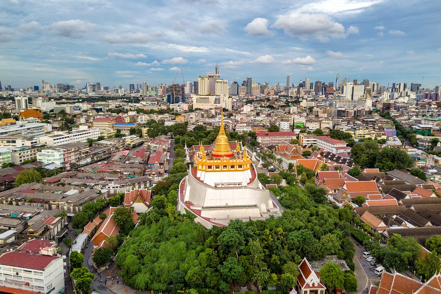 高さ 58 メートルの寺院で、当然のことながら「黄金の山」として知られています。最初は、かつては墓地だった場所の麓で木々や蔓に囲まれていますが、頂上ではバンコクの街並みの素晴らしい景色を眺めることができます。参道には参拝者が幸運を祈る鐘が並び、この静かな寺院の雰囲気をさらに高めています。