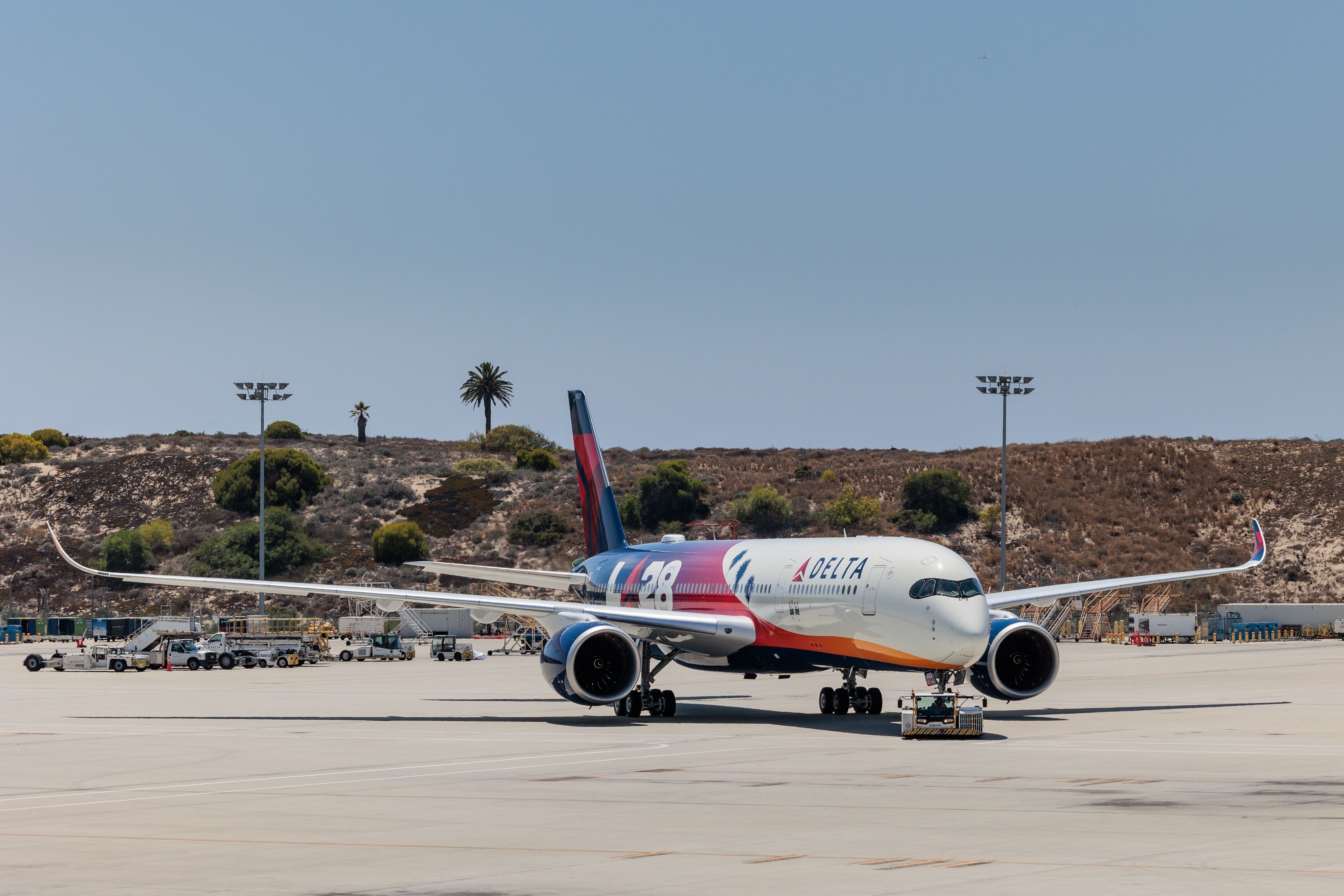 - ロサンゼルスでの2028年の試合に備えて、デルタは今年初めに別のA350-900で新しい「LA28」のカラーリングを発表しました
