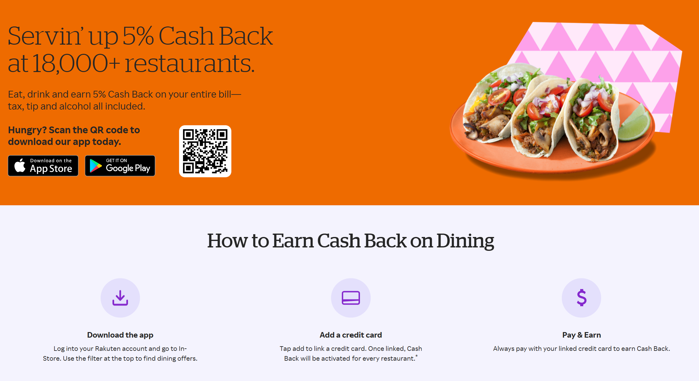 人気のあるオンラインショッピングポータルであるRakutenは、外食の報酬を獲得する機会を提供します。 Amexポイントを獲得するクレジットカードは、食事支出のキャッシュバックではなく、American Expressメンバーシップの報酬を選択できます。 Rakutenは、サインアップボーナスとして40ドルを提供しています。