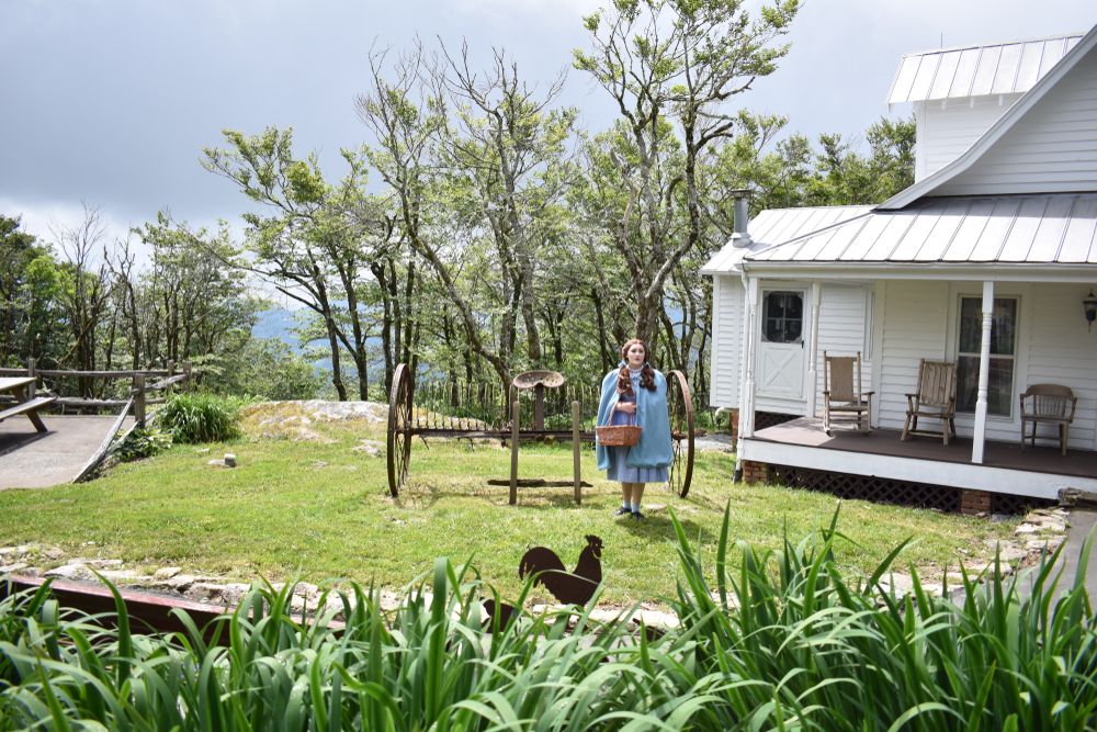 ドロシーは、米国ノースカロライナ州ビーチマウンテンのオズ公園の土地にあるガレの家族農場の家の前に立っています