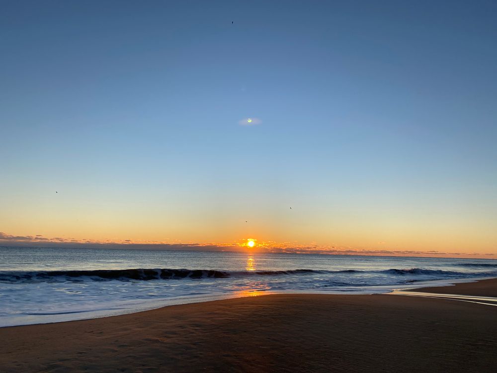 バージニア州ケープチャールズのチェサピーク湾上の夕日と月