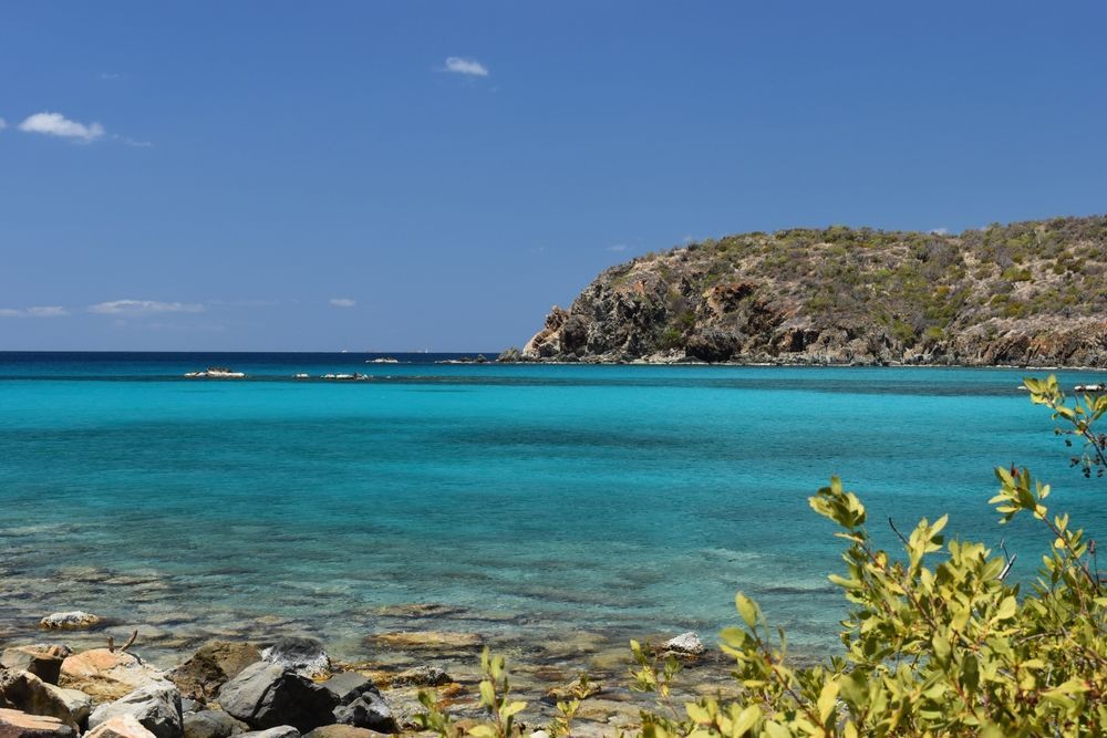 セントジョン島のバージン諸島国立公園での美しいハイキングラムヘッドにつながる、海岸沿いのなだらかな丘。旅行者は島と海岸線の素晴らしい景色を楽しむことができます。このトレイルは島の南端、ソルト ポンド ビーチの駐車場にあります。それはビーチに続く岩だらけの小道として始まります。ここに到着すると、旅行者はビーチの向こう側にあるドランク ベイとサイン ポストを示す標識に到達するまで、砂浜を踏みしめます。