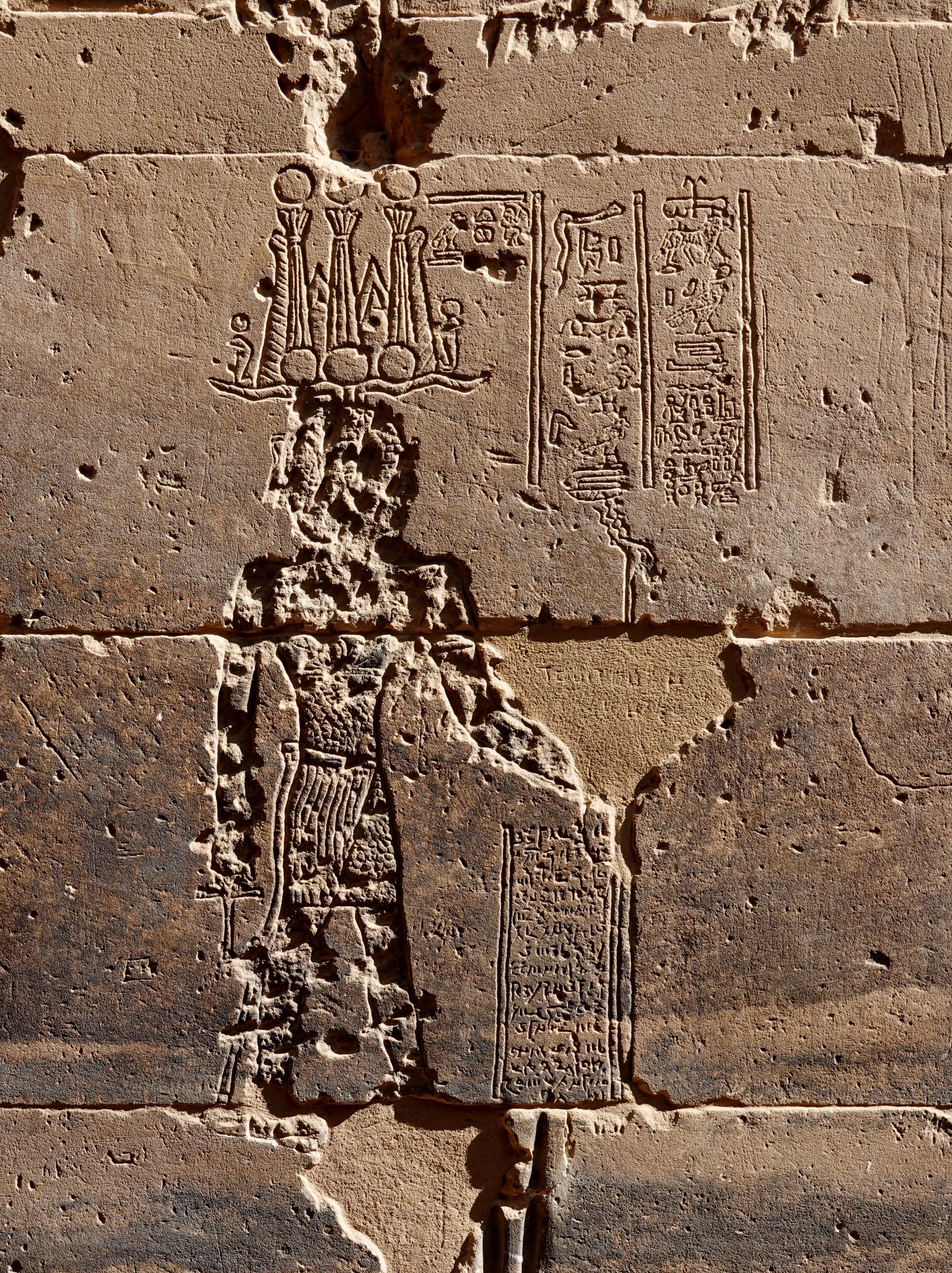 エジプト南部のフィラエにある島を拠点とする寺院の複合施設に刻まれたこの落書きは、世界史の重要な瞬間を告げています。 NesmeterakhemまたはEsmet-Akhomという名前の司祭によって作成された西暦394年8月24日に、この落書きは、すべてを見ているヌビアの太陽の神、マンドリスの刻まれたイメージを描いています。彼の横には2つの碑文があります。1つはエジプトの象形文字に、もう1つはデモティック(筆記体の形式から派生した別のエジプトのスクリプト)です。象形文字の碑文は次のように述べています