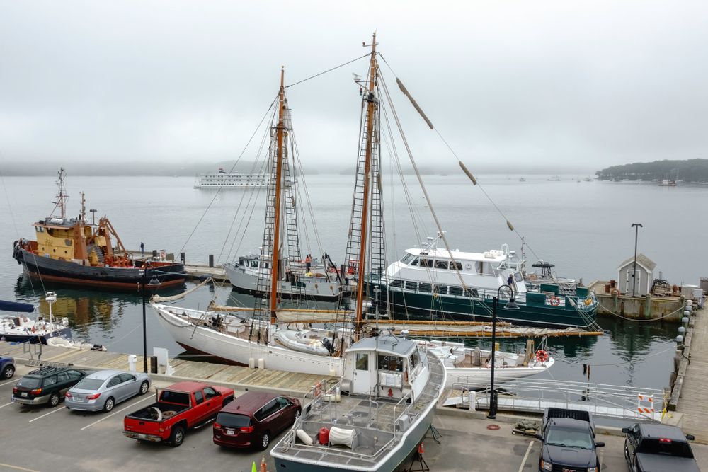 メイン州キャスティンの北極スクーナー船ボードインの港側の景色を望むウォーターフロントのシーン