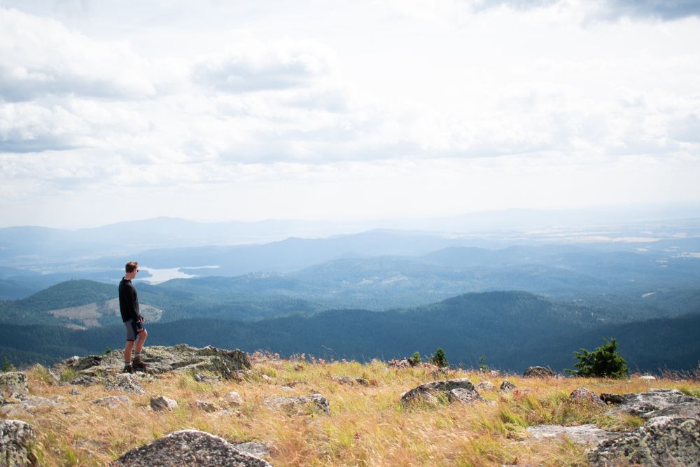 米国ワシントン州スポケーン州立公園で景色を満喫するハイカー