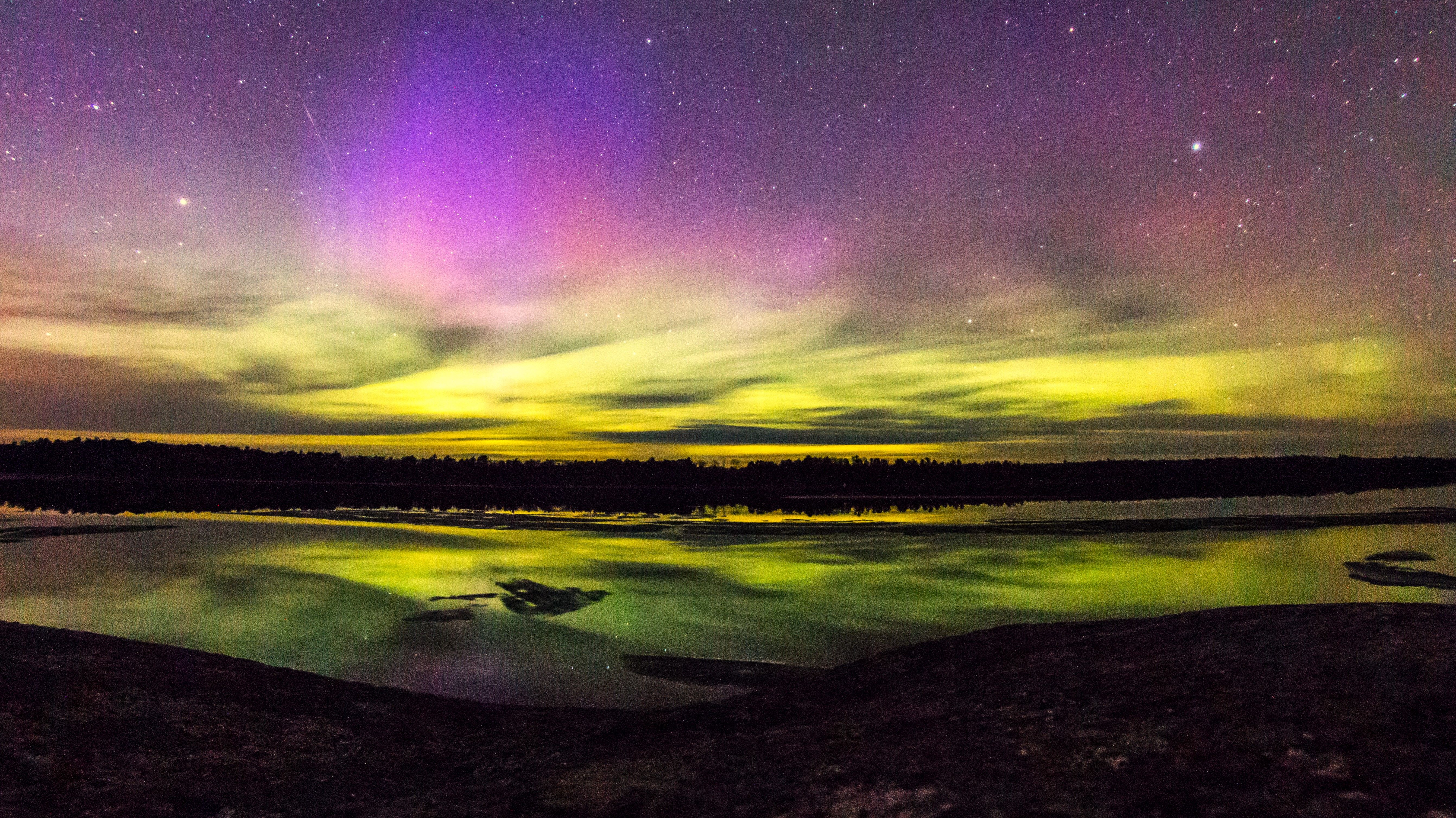 ミネソタ州北部のヴォイジャーズ国立公園の空に輝くオーロラ