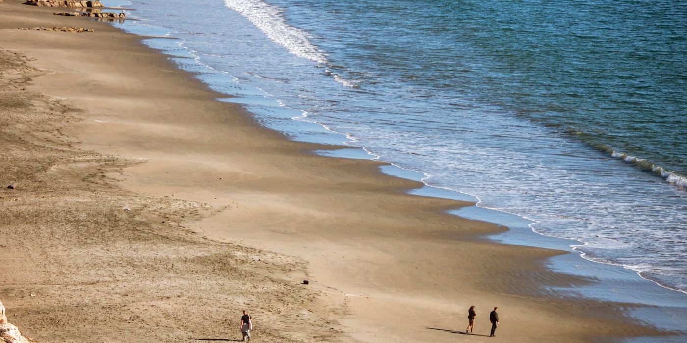 朝、ドレイクスビーチを歩いている人
