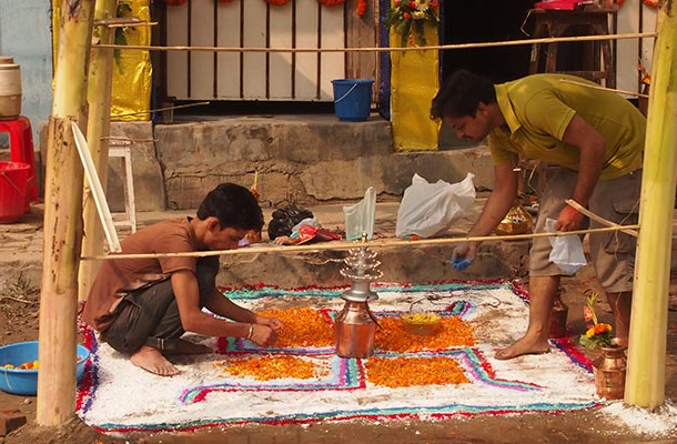 ディーパバリ祭りのために店の外の通りを飾り付ける男性たち。写真提供: エレン・ターナー