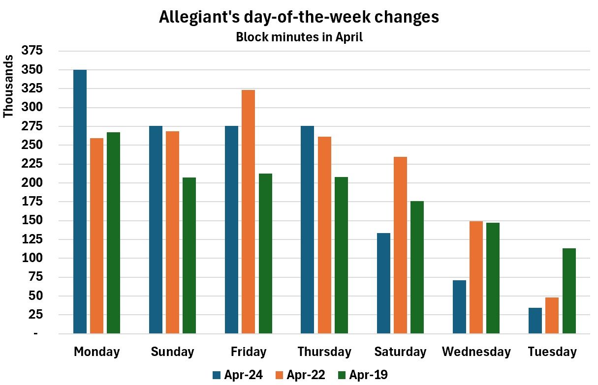 このため、Allegiant が提出したスケジュール情報は、キャンドル2024 年 4 月、2022 年 4 月、2019 年 4 月のデータが調べられ、そこからブロック議事録が導出されます。次の画像からわかるように、月曜日、木曜日、金曜日、日曜日が最も人気のある日です。