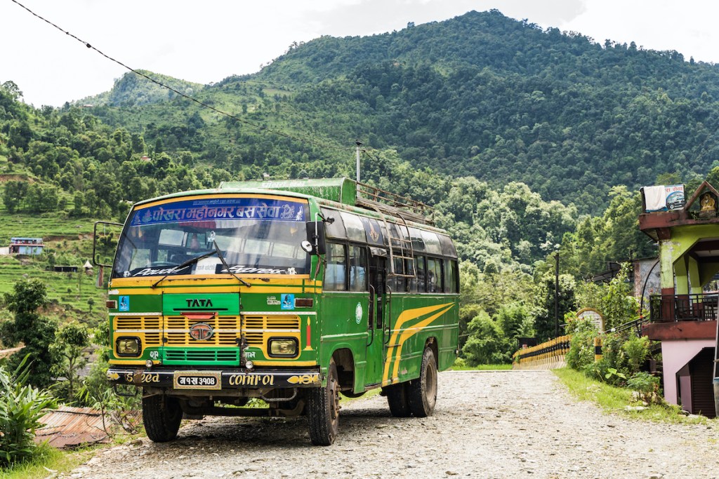 バスは主な公共交通機関です。ローカルバスはどこにでも走っており、誰でも止まりますが、信じられないほど安いとはいえ、お勧めしません。観光バスは都市間の移動に最も一般的な交通手段で、ローカルバスよりも快適で混雑も少ないですが、移動は長くて大変になる場合があります。道路は衝撃的で、渋滞はひどいもので、バスは食事やお茶の休憩のために頻繁に止まり、故障やパンクがほぼ確実に発生します。カトマンズからポカラまでの124マイルを移動するのに7時間かかったことがあります。
