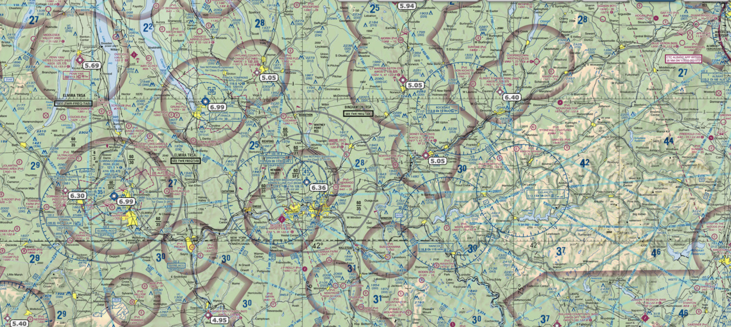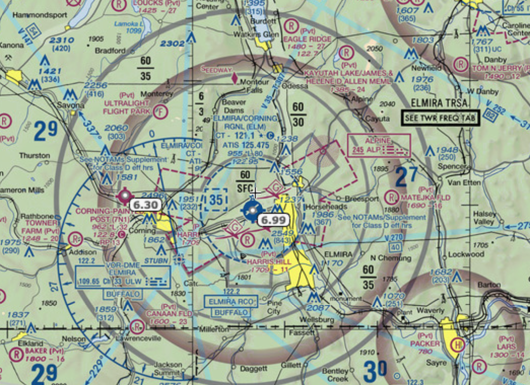 クラス E 空域は 3 つの方法で断面図に表示されます。マゼンタの破線は、クラス E 空域が空港周辺などの地表から始まることを示します。このタイプの空域は、曇りの日に管制塔のない空港に到着する航空機を特別に保護します。エルマイラ コーニング地域空港 (ELM/KELM) は、この拡張子で示されています。