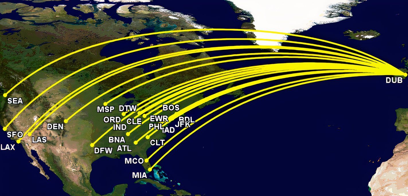 10月21日の時点で、最新の情報は5人のオペレーターが記録にノンストップで飛行することを示しています22米国空港ダブリンから 冬/夏のネットワークが組み合わされている場合。これは、ロンドンヒースロー(31)とフランクフルト(29)を除く他のヨーロッパの空港よりも多くです。 Aer Lingusの最新のルートは、Dubinが追い越したことを意味します。