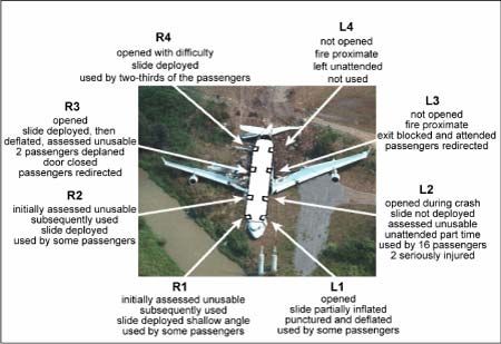 左側の後部の2つのドアは、火のために閉じたままでした。右側のスライドの1つは破片で穴を開けたため、収縮しました。左側の1つのスライドは展開しませんでした。使用可能なのは8つのうち4つの出口だけでした。パニックでは、一部の人々はスライドなしでドアから飛び出し、秋に負傷しました。キャビンクルーは、使用できなかった出口から乗客を誘導しました。衝撃により、いくつかのドアが開くのが難しくなり、いくつかのスライドが影響を受けました。