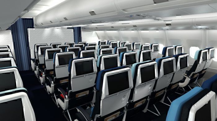エコノミーキャビンには、3-4-3の構成で配置された残りの268席があります。座席の幅は17.2インチ、ピッチは31インチです。各シートバックには、11.7インチのタッチスクリーンとUSBおよびACパワーアウトレットがあります。