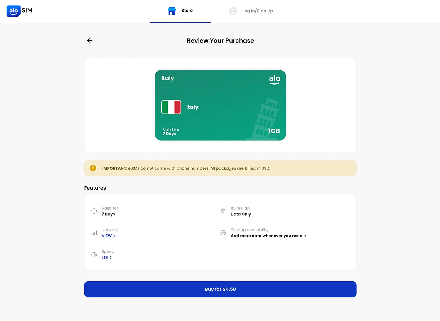 他の eSIM 会社とは異なり、aloSIM を使用すると、まったく新しいトラベル eSIM を購入してダウンロードするのではなく、データが足りなくなったときに簡単にデータを追加できます。アカウントにログインし、登録されているカードを使用して数秒でチャージするだけです。