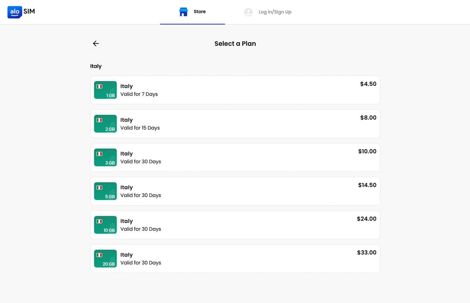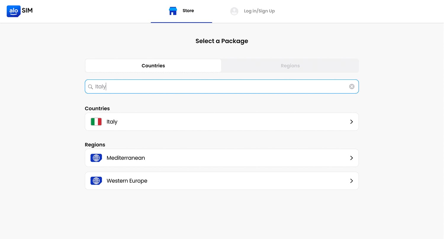 aloSIM から eSIM を購入してダウンロードするには 2 つの方法があります。 aloSIM モバイル アプリをダウンロードすることをお勧めしますが、ラップトップ、タブレット、または携帯電話の Web サイトから購入することもできます。デバイスとの互換性を確認したら、訪問予定の国または地域を検索すると、利用可能なすべてのプランが表示されます。