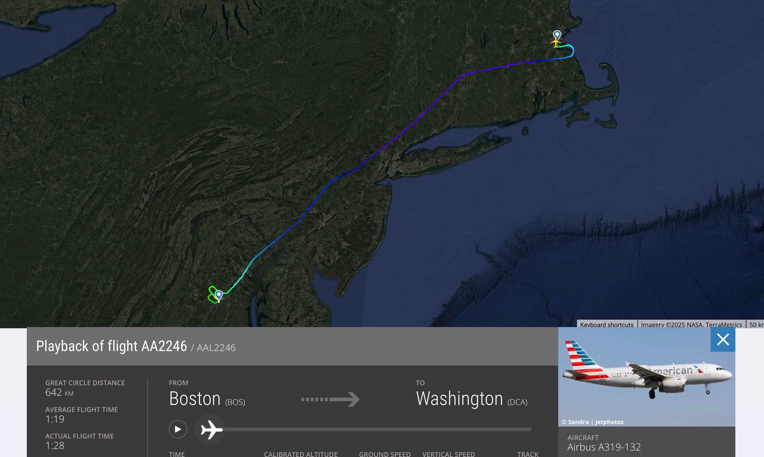 現地時間の午前8時30分頃、リーガン・ナショナル空港に最終進入していたところ、管制官が同便のパイロットに対し、ポトマック川北側から滑走路19への着陸からわずか1マイルのところで(文字通り)直前に引き返しるよう指示した。なぜ?別のアメリカン航空の便がありました。