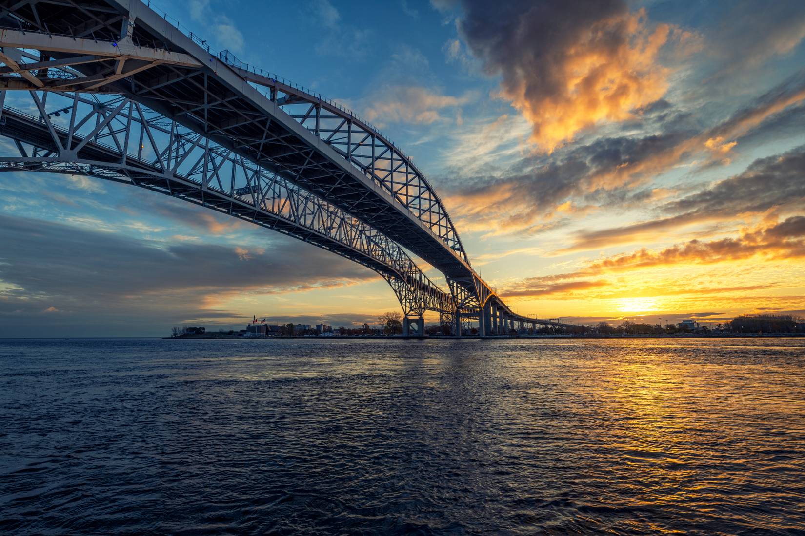 国際国境越え。アメリカとカナダの国境を越えるブルーウォーターブリッジの夕日。この橋はミシガン州ポートヒューロンとオンタリオ州サーニアを繋いでいます。クレジット: Shutterstock 経由