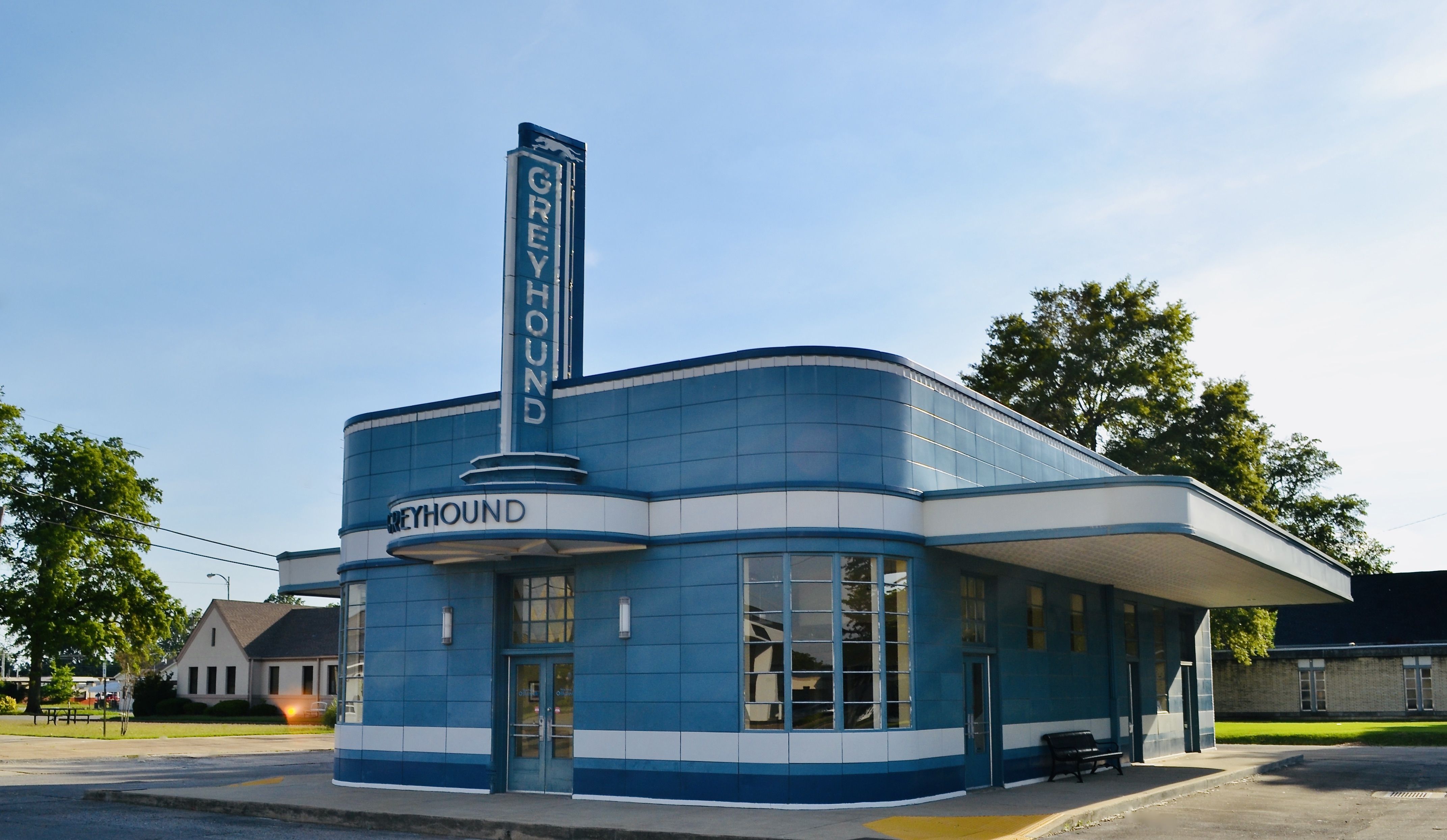 アーカンソー州ブライスビルにある歴史あるグレイハウンド バス車庫は、建築家のウィリアム ノーランド ヴァン パウエルとベン ワトソン ホワイトによって 1937 年に建設されました。この建物は、アールデコと密接に関連した建築の一種である流線型モダンのデザイン要素を特徴としています。アールデコは大胆な幾何学模様に焦点を当てましたが、ストリームライン モダンは空気力学的外観をエミュレートする滑らかな曲線と水平線を強調しました。によると、建築史家協会、この駅はアーカンソー州で唯一のストリームライン モデルヌ グレイハウンド バスステーションであり、オリジナルの青いガラス パネル、アイボリーのトリム、丸い角が今でも特徴です。入り口の上にあるオリジナルのグレイハウンドの看板も残っています。