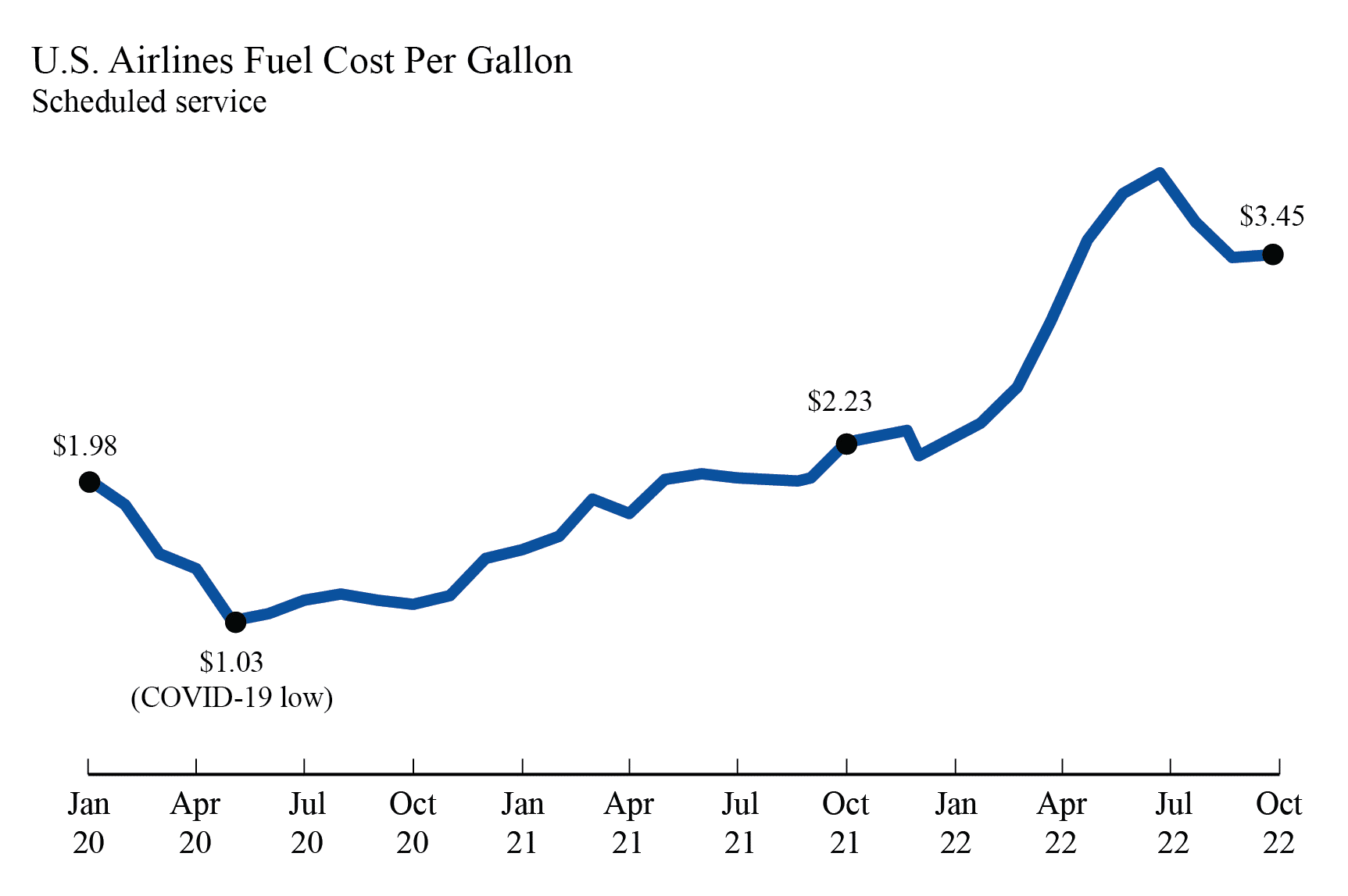 - ジェット燃料のコストは、2019年4月に1バレルあたり63ドルでしたが2023年に1バレルあたり85ドル以上上昇しました。