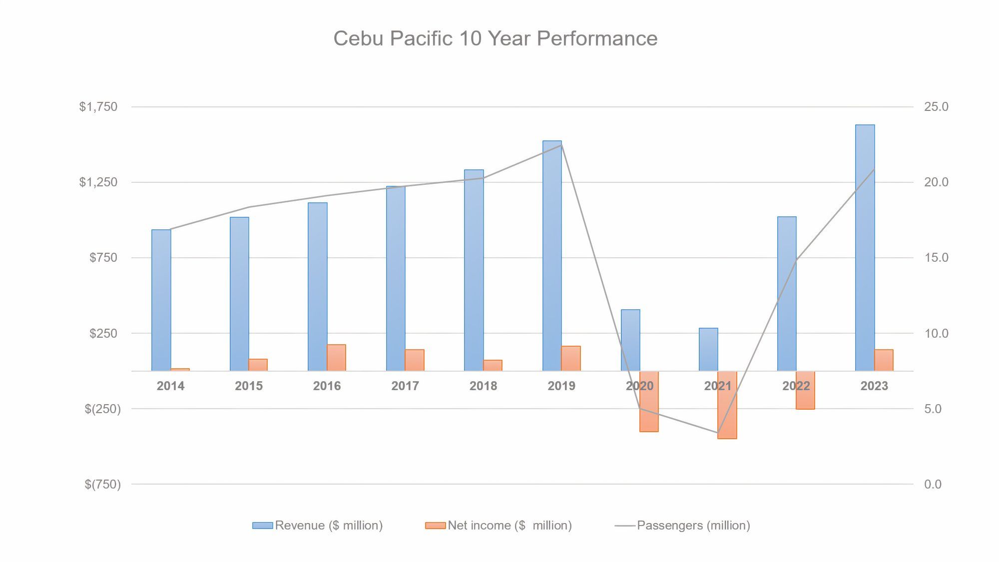 また、明らかなことは、2023年には収益が記録的なレベルにあったが、乗客数はまだパンデミック以前のレベルに達していないことです(2023年には20.9百万で、2019年には2250万)。これは、セブパシフィックがパンデミックの前よりも乗客あたりの収入を増やしていることを意味します。