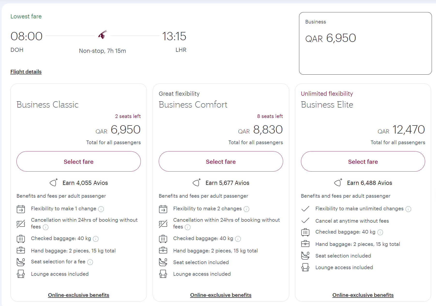 - カタール航空 – ビジネス ライト、クラシック、またはコンフォート
