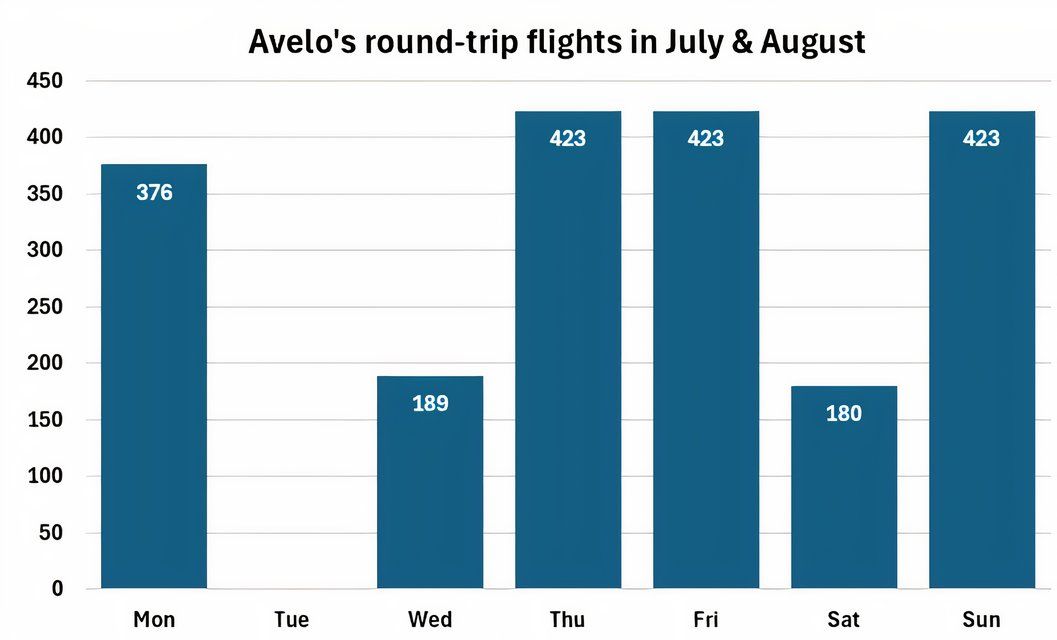 知らせ彼らは主張するは、これまでのところ、人気のない日には大幅にフライトが少なくなることで最も有名な航空会社です。ピーク時の飛行の約 6% は火曜日に行われますが、その割合は主要曜日に比べて大幅に低くなります。サービスが大幅に多い、または少ない日はアレジアントの DNA の一部ですが、新型ではるかに高価なボーイング 737 MAX 8-200 がさらに多く導入されると、状況は多少変わる可能性があります。火曜日のフライトが少なかったため、アベロがアレジアントを追い抜いたことは非常に興味深いことです。