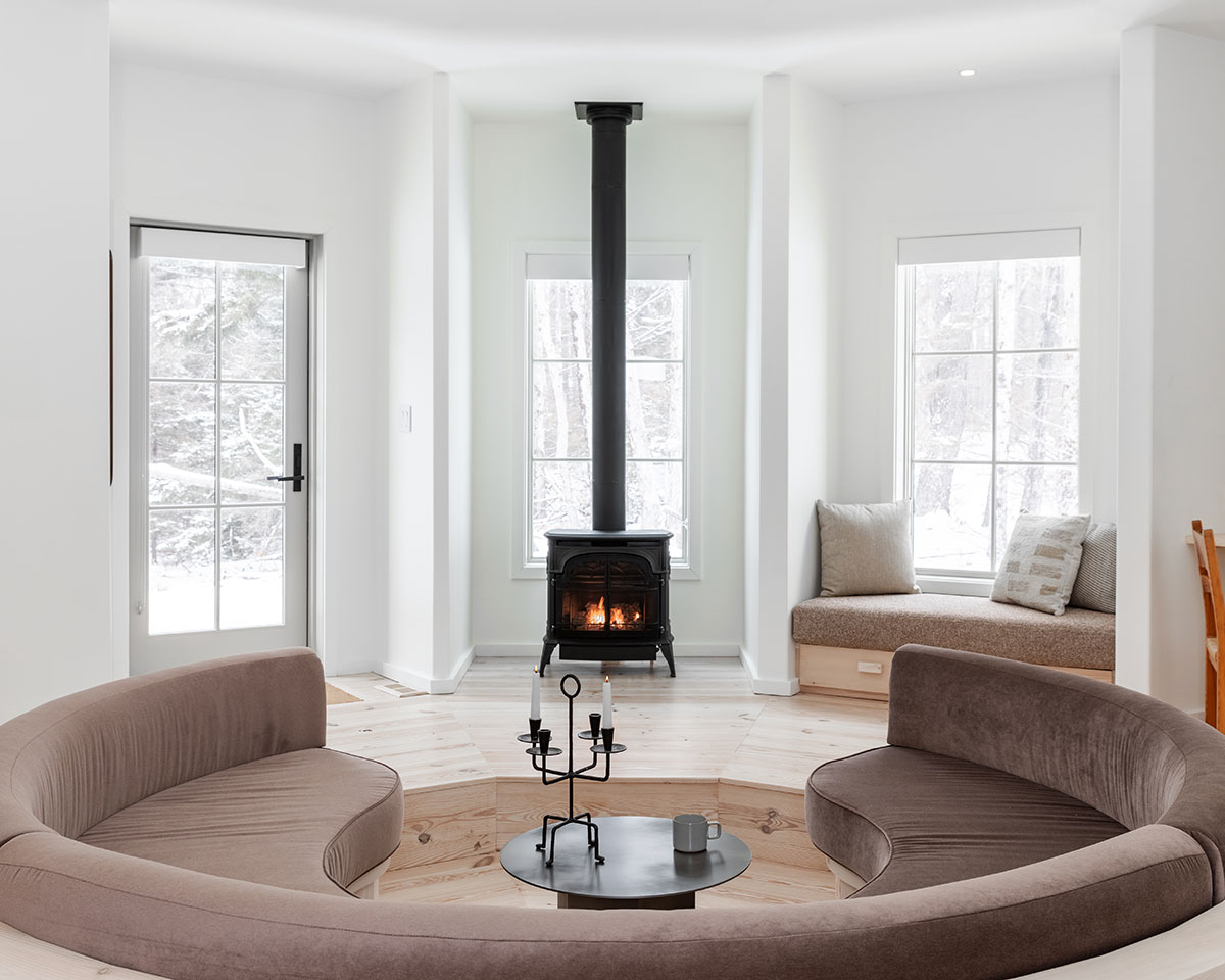 キャッツキル山脈のスクリブナーズ ロッジに新しく加わったザ・ラウンドズへようこそ。ラウンドとは、施設の独立したキャビン構造を指します。幾何学的な建築に興味がある人のために説明すると、これらは 12 面体ですが、おそらくインテリアにもっと注目するでしょう。