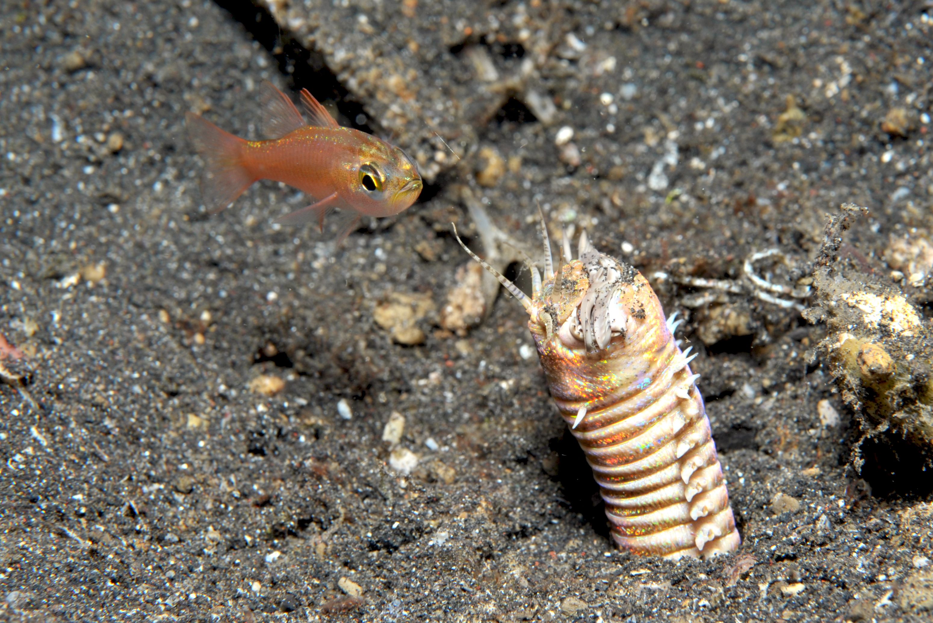 海の砂底ではまぶしいですが、獲物にとっては悪夢です。ボビットワームは美しい生き物ですが、印象的で致命的です。格納式の下顎またはカミソリのように鋭い顎を使って魚を真っ二つに切ります。