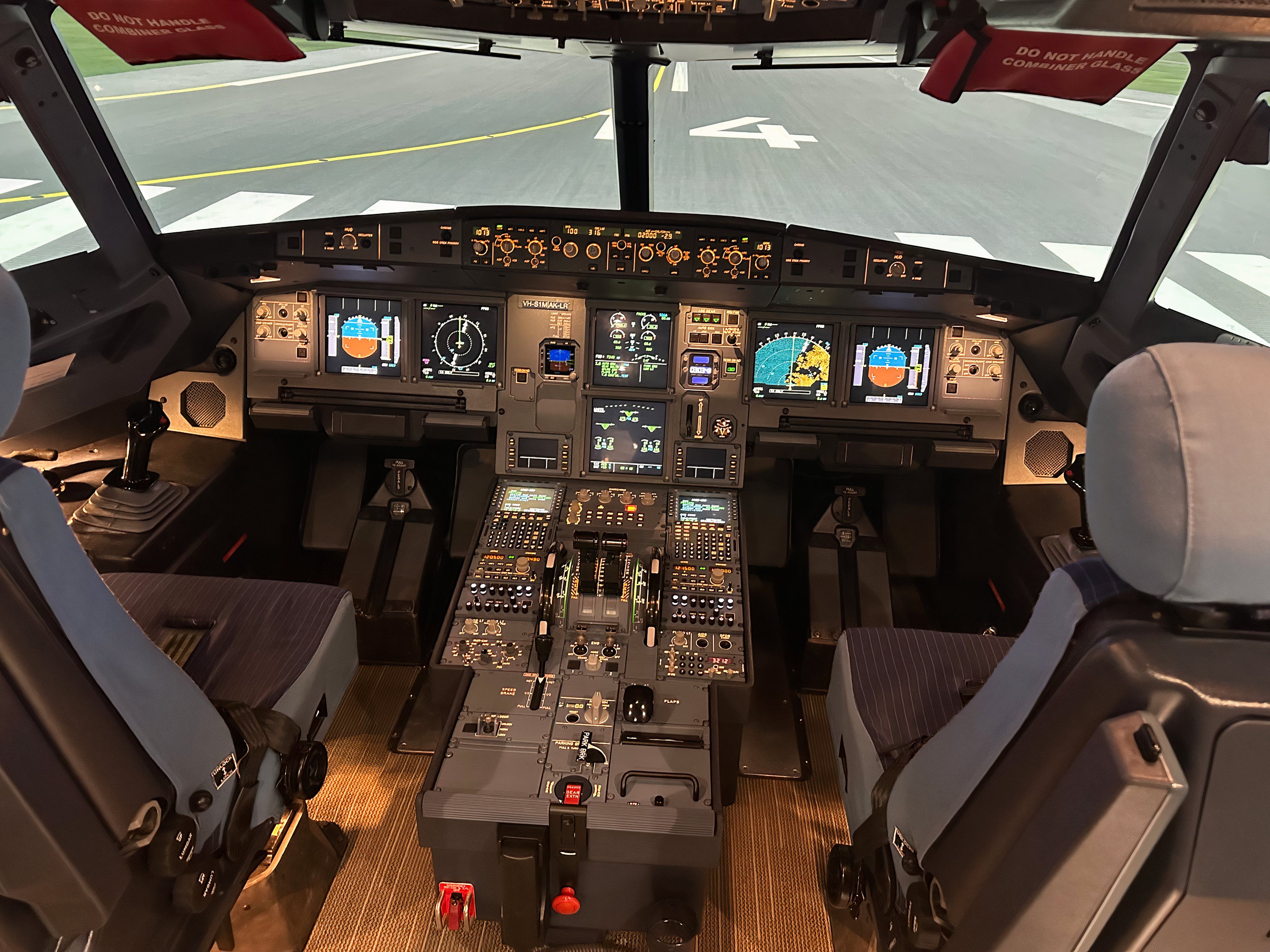 公式式典が終了した後、CAE は私を新しい CX7000XR A320 シミュレーターで飛行するよう寛大に招待してくれました。それで、階段を上がって右側の席に着いたのですが、そこでストラップを締めてシートを正しく配置するだけでも困難であることがわかりました。元オーストラリア空軍パイロットである私の機長がこの体験に乗り気だったので、私を手順に沿って案内し、航空機に燃料を補給してゴールドコースト空港の滑走路に滑走できる準備を整えてくれました。