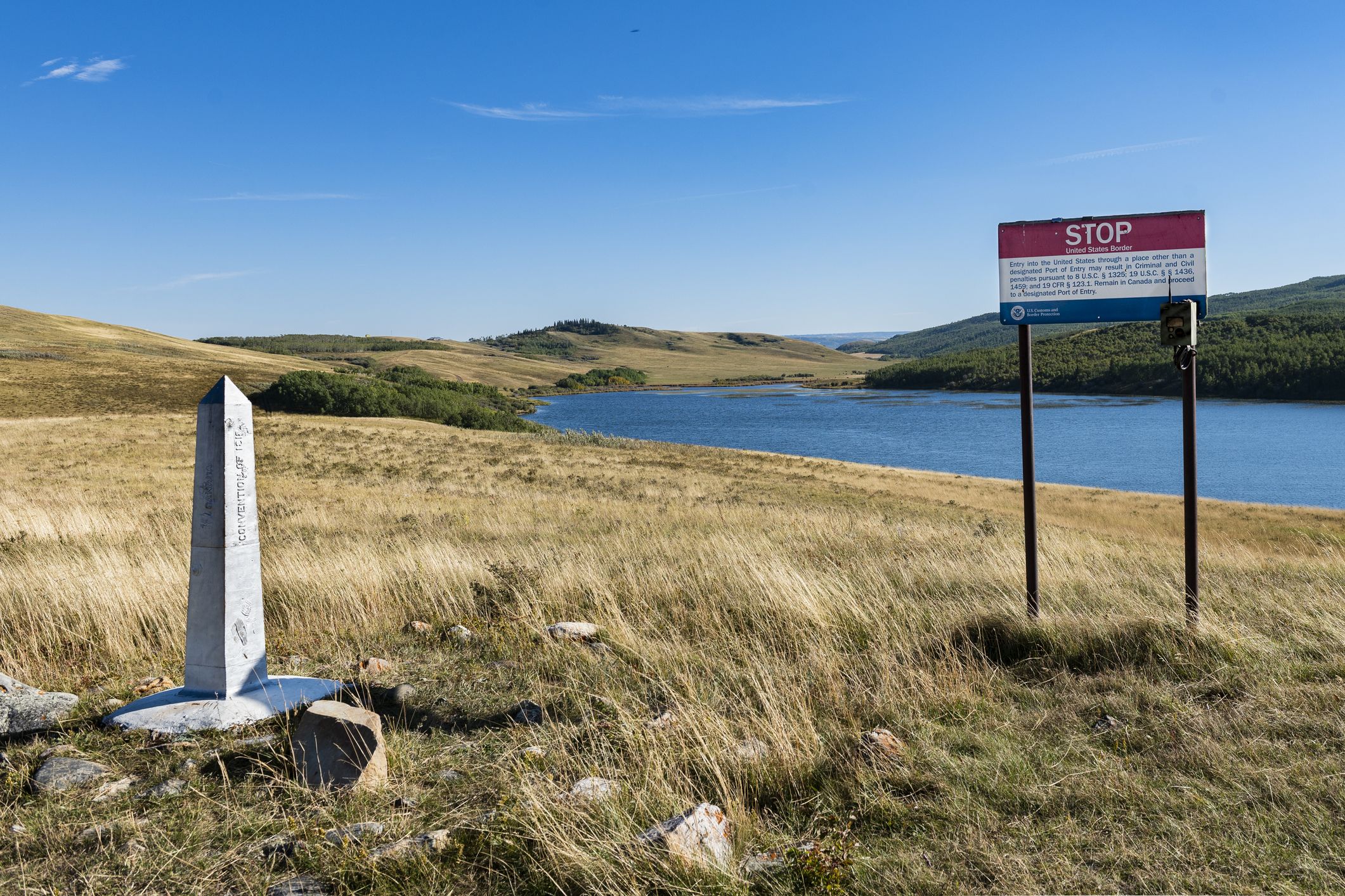 米国モンタナ州とカナダのアルバータ州との国境にある条約境界標識