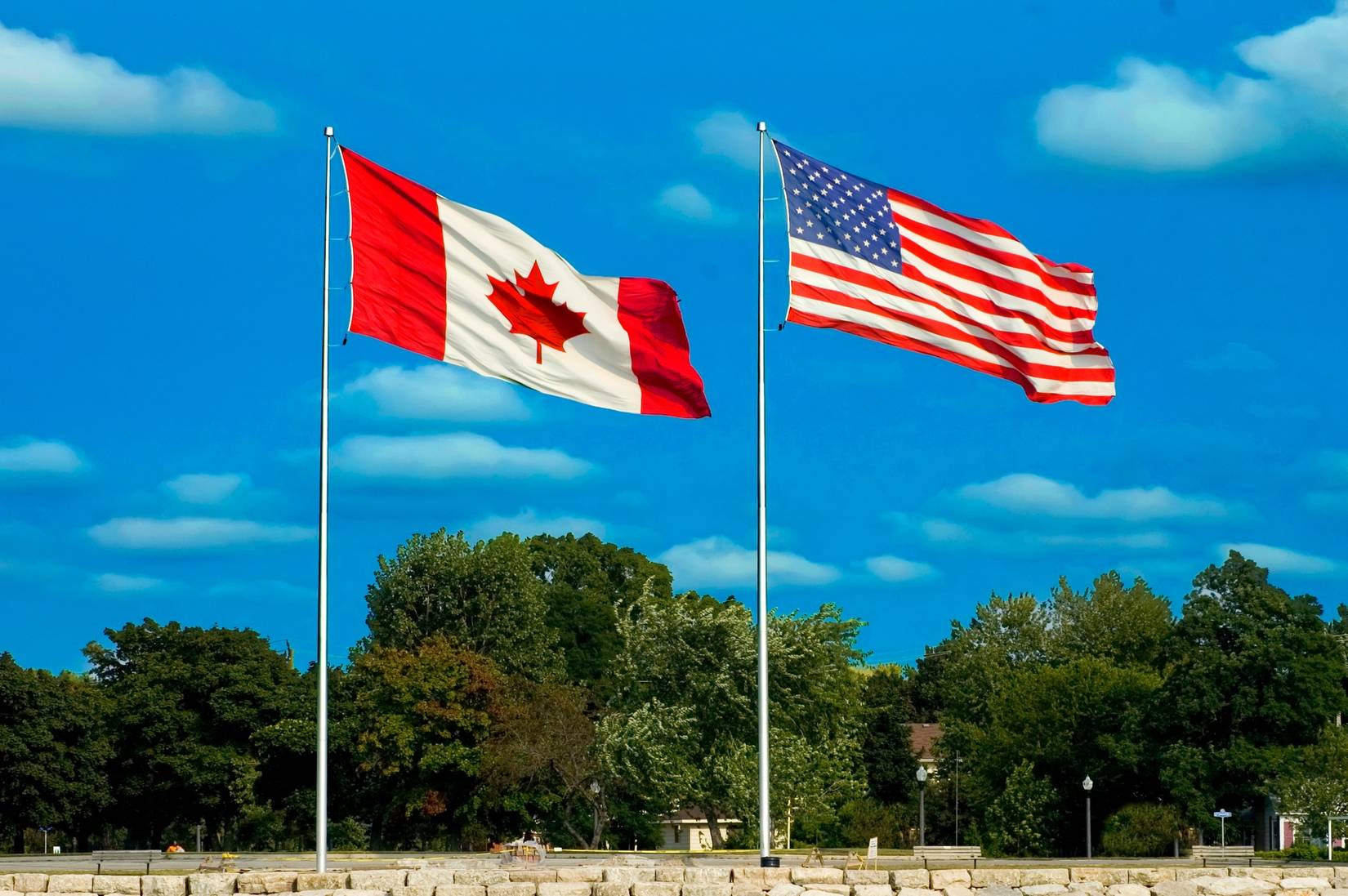 アメリカとカナダの旗は、ポートヒューロンミシガンとオンタリオ州のカナダであるサルニアで並んで飛びます。