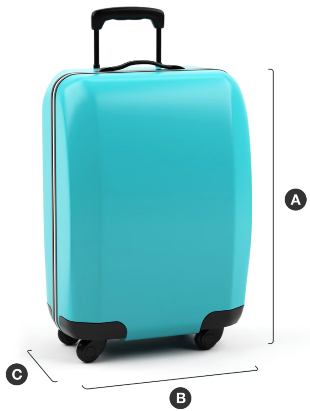 バッグの総線形寸法は、118 cm(46.5インチ)を超えることはできません。航空会社のde Havilland Dash 8 Q300航空機を飛んでいる乗客の場合、バッグの幅(画像でCで示される)は22 cm(8.7インチ)を超えてはなりません。