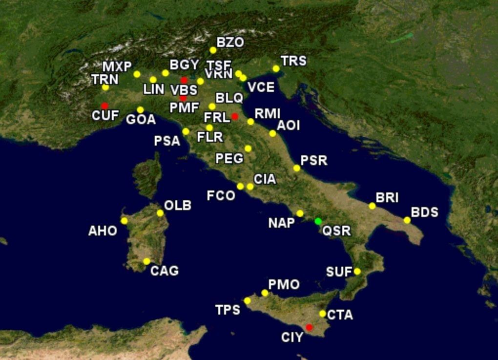 CUF (クネオ)、VBS (ブレシア)、PMF (パルマ)、FRL (フォルリ)、CIY (コーミソ) の 5 つの空港が赤色で表示されていることがわかります。これらはすべてロンドンのサービスを終了しました。最も最近運航されたのは CIY で、2019 年 6 月まで運航されていました。